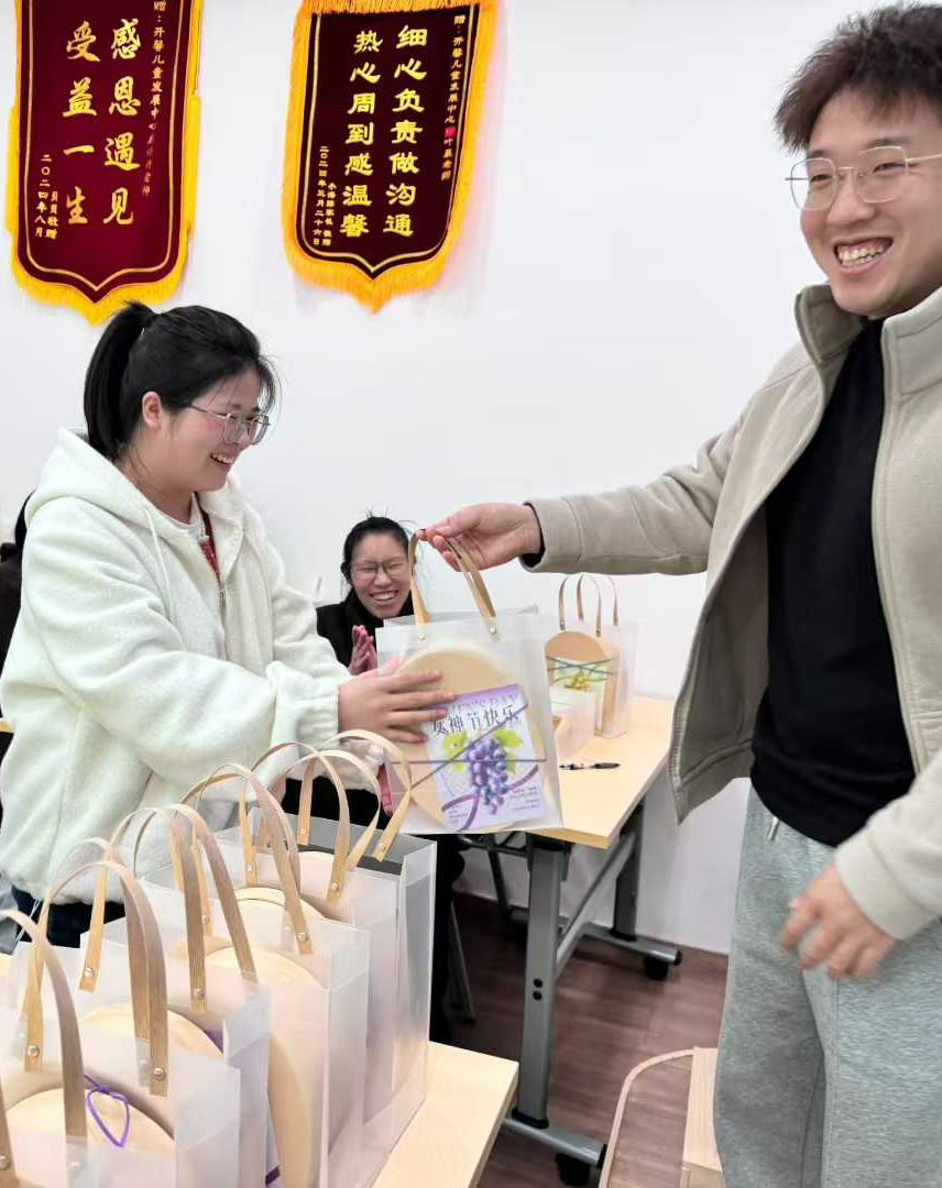她们,是暗夜里点灯的人 在特教领域,没有“桃李满天下”的即时成就感,有的往往是日复一日的重复:一个发音教了千百遍,一个动作辅助了无数次。 孩子们的每一次微小进步,都凝聚着她们无尽的汗水和心血,她们是老师,更是守护者,为了感谢全体女教职工的辛勤付出与无私奉献,今天,向老师和杨校长特意为大家精心准备了节日礼物。 每一份礼物,都精心挑选。 希望能在这个特殊的日子里,为忙碌的妳送去一份甜蜜,为疲惫的妳带去一丝慰藉。 当一份份承载着关怀的礼物送到老师们手中时,老师们的脸上洋溢着幸福的笑容。礼物虽轻,却承载着机构对大家深深的敬意和感谢。 生活中的妳,或许是女儿,是妻子,是母亲。 工作中的妳,是孩子们最依赖的“老师妈妈”。 最后,再次祝愿全体女教职工及天下所有女性: 风生水起,吉祥如意,财源广进,金玉满堂,万事亨通,芳华自在,平步青云,如日中天。 如有需要,扫描下方二维码,预约免费评估。 END 开馨儿童发展中心 电话:13362070515(课程顾问叶老师) 地址:丽水市莲都区丽青路323号